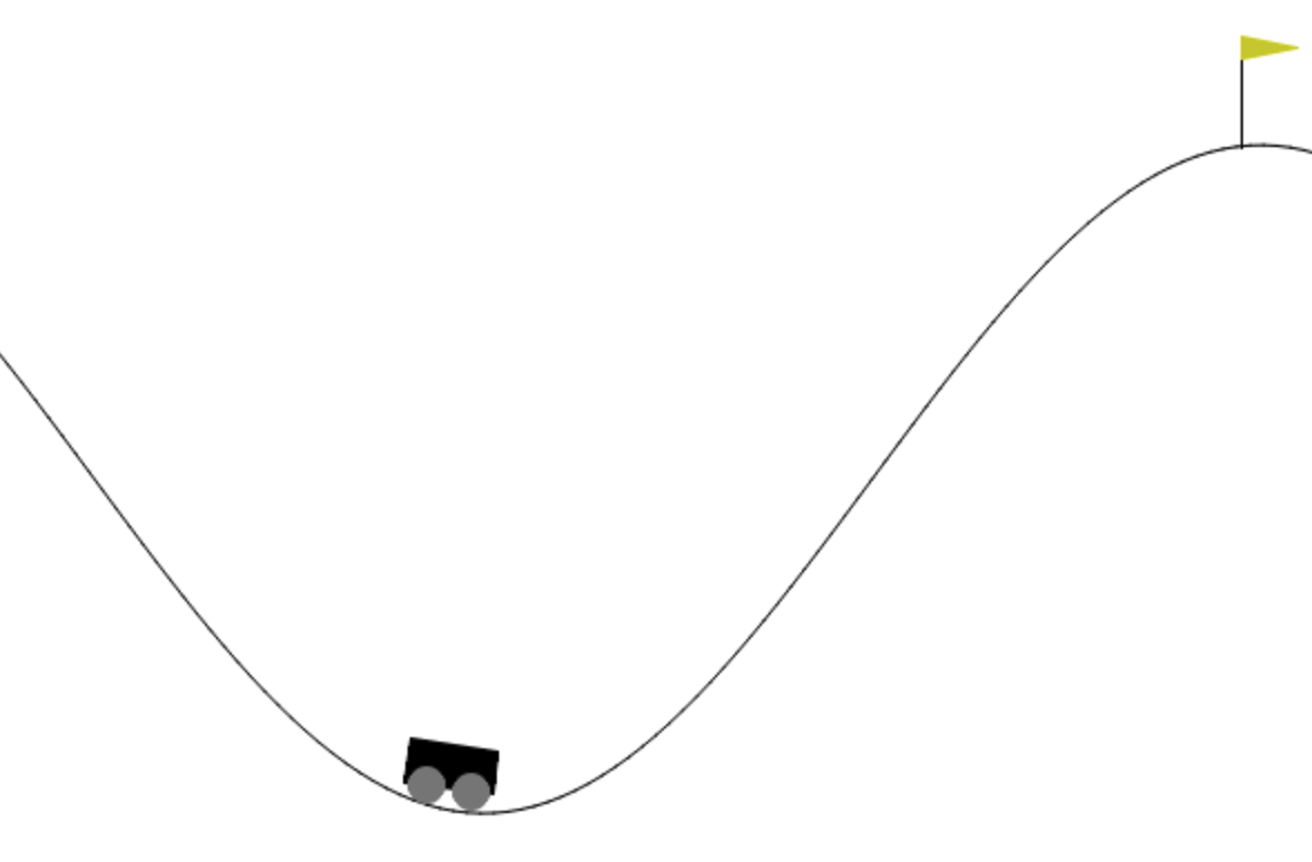 The state of the environment is provided as a pair (position, velocity). The starting position is randomized within a small range at the bottom of the hill. At each step, the actions are either to accelerate to the left, to the right, or do nothing, and the transitions are determined directly from the physics of a frictionless car on a hill. Every step produces a reward based on the car's distance from the goal and velocity.