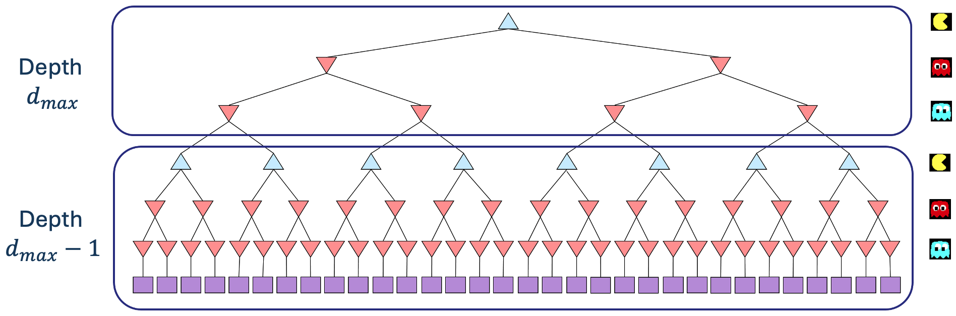 Comment: In reality, all the agents move simultaneously. In our formulation, actions at the same depth happen at the same time in the real game. To simplify things, we process Pac-Man and ghosts sequentially. You should just make sure you process all of the ghosts before decrementing the depth.